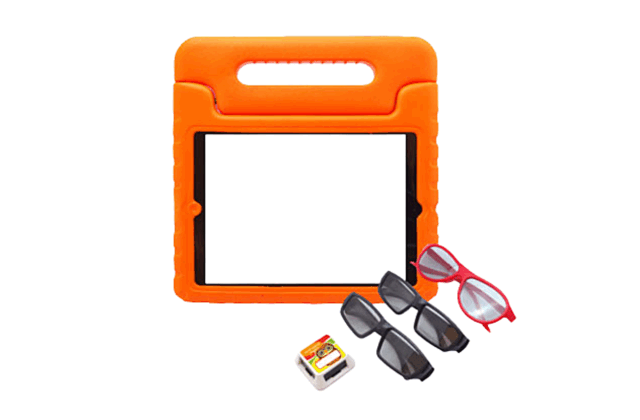 タブレット画面は裸眼では白く見えますが、専用メガネをかけることで、弱視側の目にだけ映像が見える仕組みになっています。